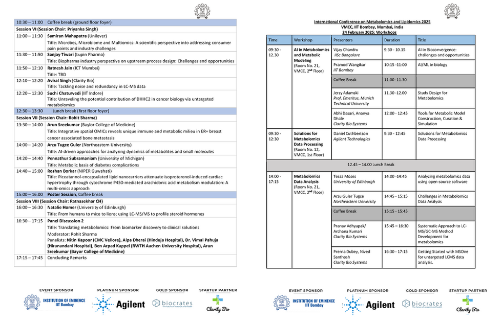 We organized the International Conference on Metabolomics and Lipidomics (ICML2025) at IIT Bombay (February 25-26, 2025). ICML 2025 brought together leading experts from academia, industry, and healthcare to explore recent advances in metabolomics and lipidomics. The event featured a dynamic scientific program spanning novel analytical technologies, data processing and bioinformatics, and cutting-edge applications in healthcare and biomedical research, biomanufacturing, and systems biology.